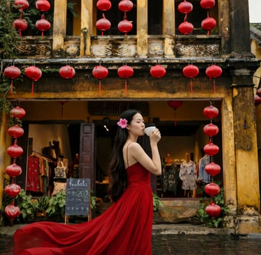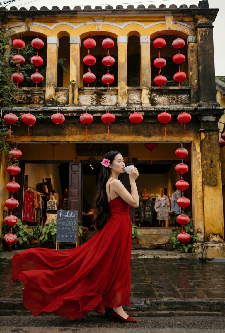In her flowing red dress, she represents passion and timeless elegance. She carries the charm of old Saigon’s marble-table cafés and the quiet depth of old Hanoi’s historic streets.